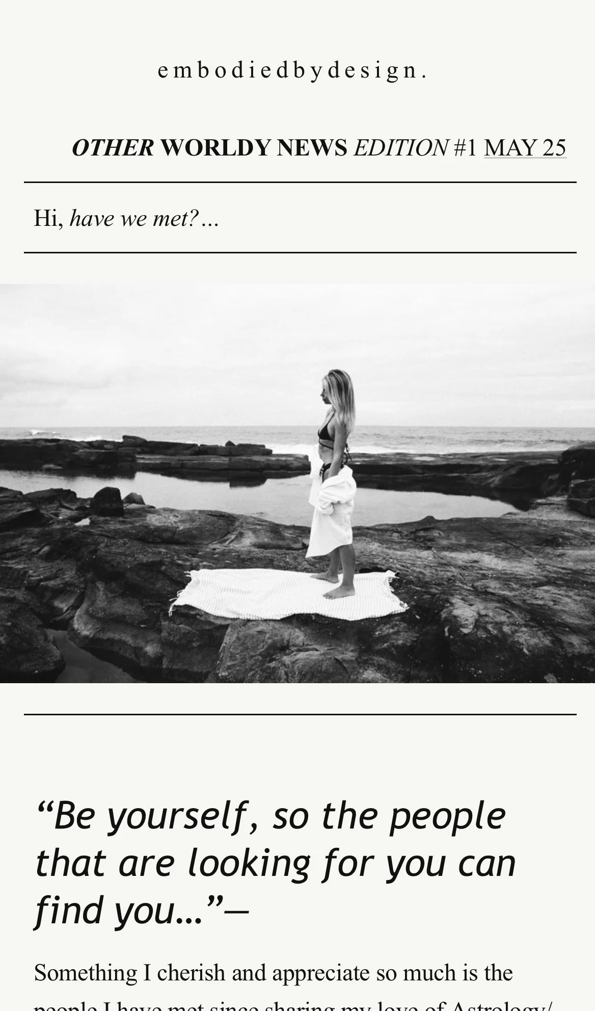 OTHER WORLDLY NEWS A monthly “other worldly “ update of all things Astrology, Human Design, wellness & spirituality. Edition#1 just released MAY 25 Email Address Sign Up We can all do with some magic from other worlds sometimes…Thank you for signing up!